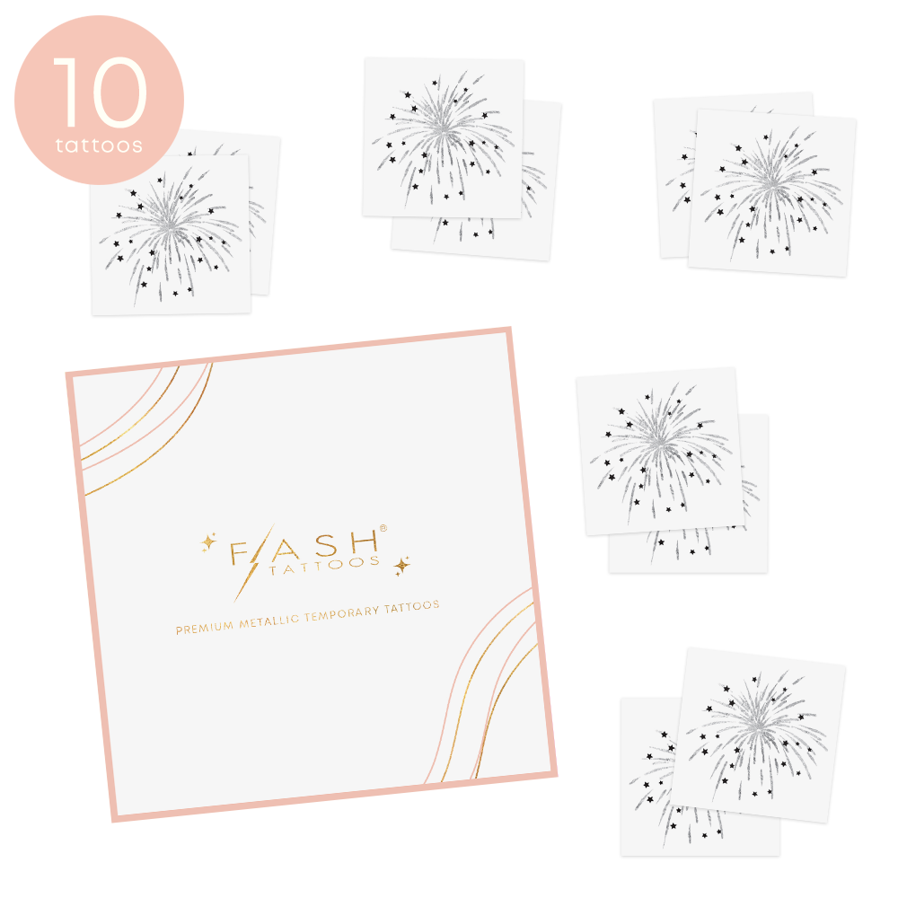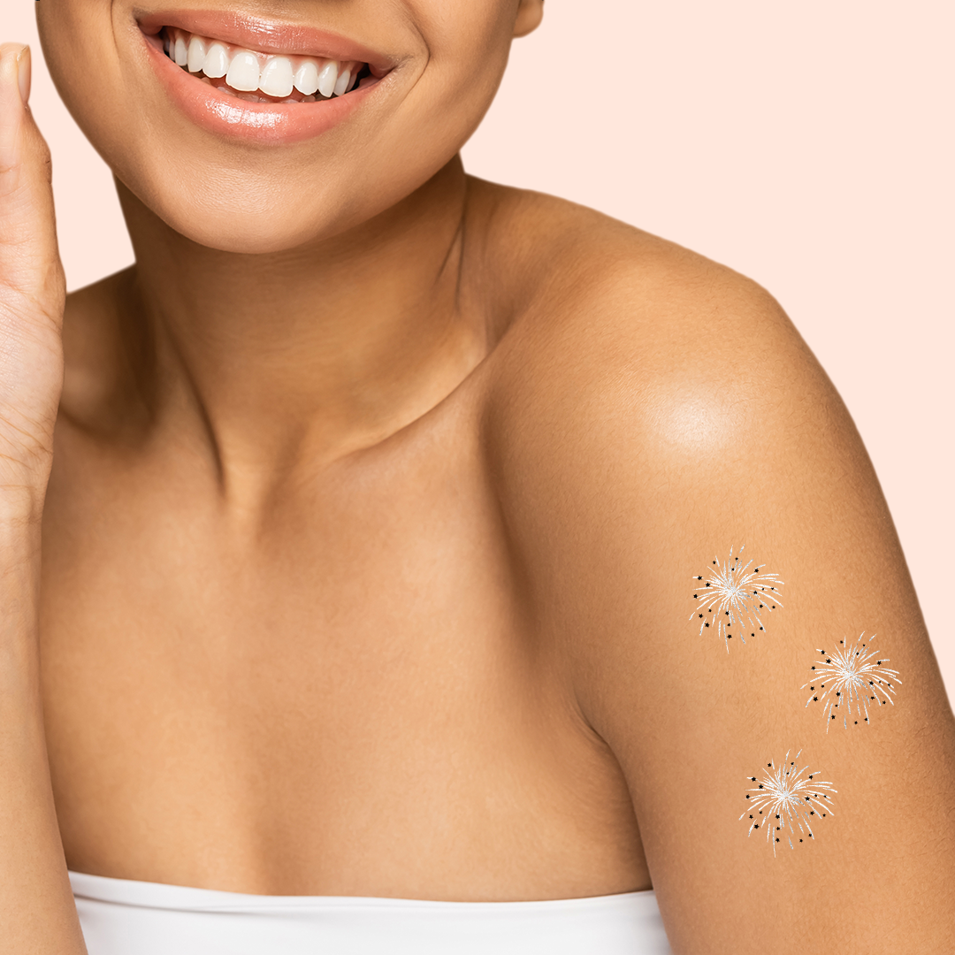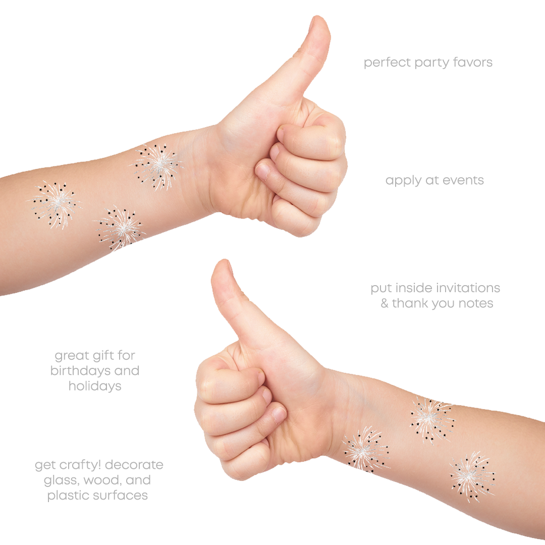 These Flash Tattoos® are ready to party! Celebrate in style with the “FIREWORK SPARKLE” party tat set, perfect for New Years celebrations, events, parties and more!