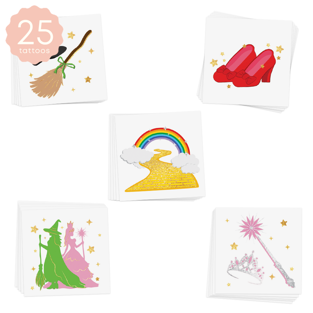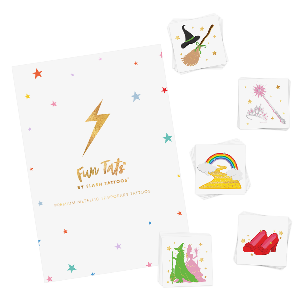 A set of 25 pre-cut temporary tattoos featuring 5 movie inspired designs, the “WITCHES WIZARDS OH MY” variety set is ready for some fun!  Fun Tats temporary tattoos are perfect for vacations, school events, special celebrations, and everyday fun. A great birthday present for kids of all ages. Pop them into goodie bags. Set up a tattoo bar at parties, Decorate party décor. Play dress up. Share with your best friend and classmates. Ditch sugary treats during the holidays and pop into Easter baskets, Valentine’s gifts, and Christmas stockings. The possibilities are endless!